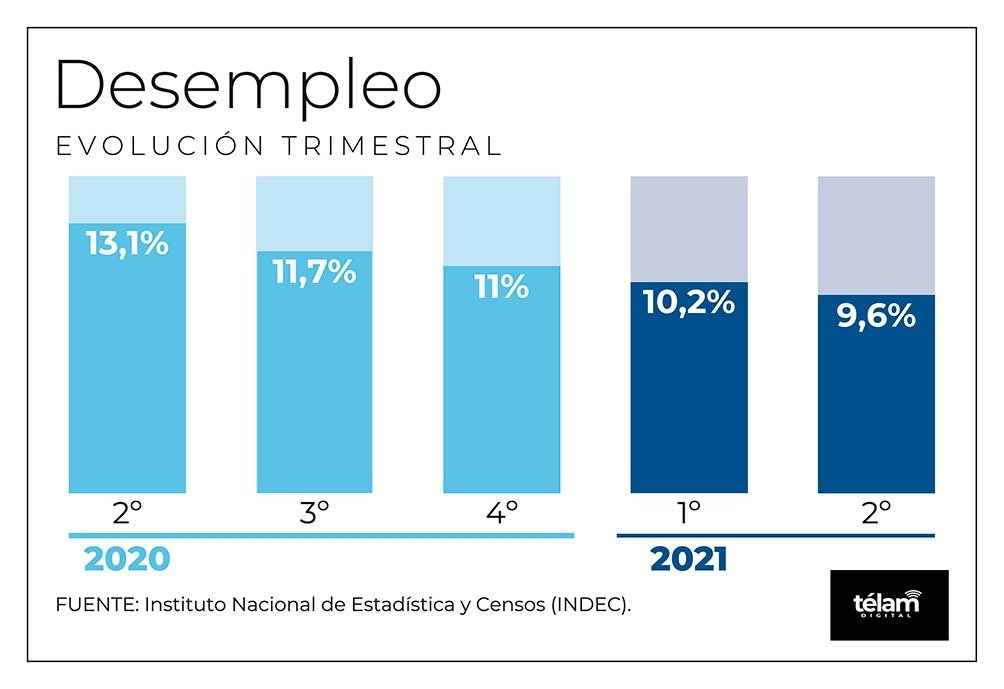 El índice de desempleo se ubicó en el 9,6% al cierre del segundo trimestre, por debajo del 13,1% de igual período del 2020, y del 10,2% del primer trimestre del corriente año, informó el Instituto Nacional de Estadística y Censos (Indec).