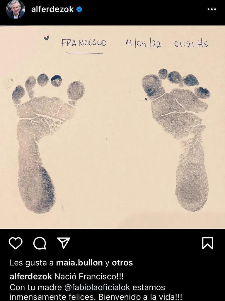 “Nació Francisco!!!, Con tu madre @fabiolaoficialok estamos inmensamente felices. Bienvenido a la vida!!!”, escribió el presidente en su cuenta de Instagram, con una foto en la que pueden verse las huellas de los pies del bebé.